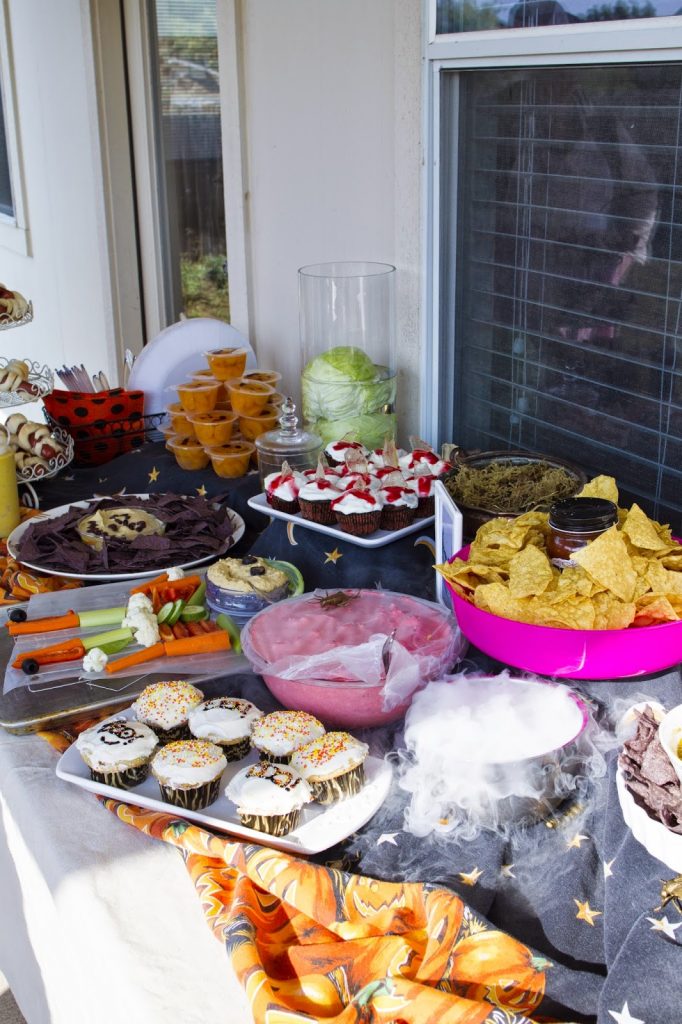 We had a wickedly awesome buffet full of a skeleton veggie tray, mummy dogs, jack-o-lantern oranges, ghost bananas, frankenpops, bloody cupcakes and much more!