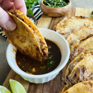 Birria Queso Tacos are made with slow cooked tender beef seasoned with chilies and spices. Once the beef is shredded it’s then wrapped in a corn tortilla with cheese and cilantro. Grilled until the the tortilla is crispy and the cheese is melted. The best part is dipping the hot taco into the flavorful consume.