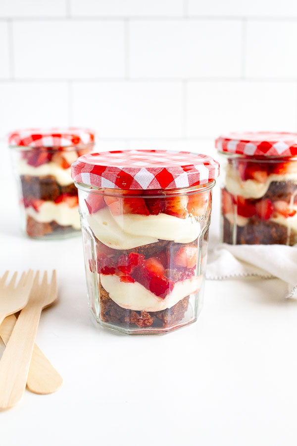 Brownie Strawberry Trifle is layered with fudgy brownies, fresh strawberries and sweet cream cheese frosting. Creating these mini desserts in recycled small jam jars just adds the perfect presentation touch!