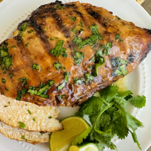 Cilantro Lime Chicken starts with an easy marinade with ingredients you may already have on hand. Soy sauce, vegetable oil, brown sugar and garlic. The chicken breasts is then grilled to perfection and brushed with a lime cilantro butter.
