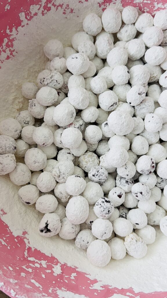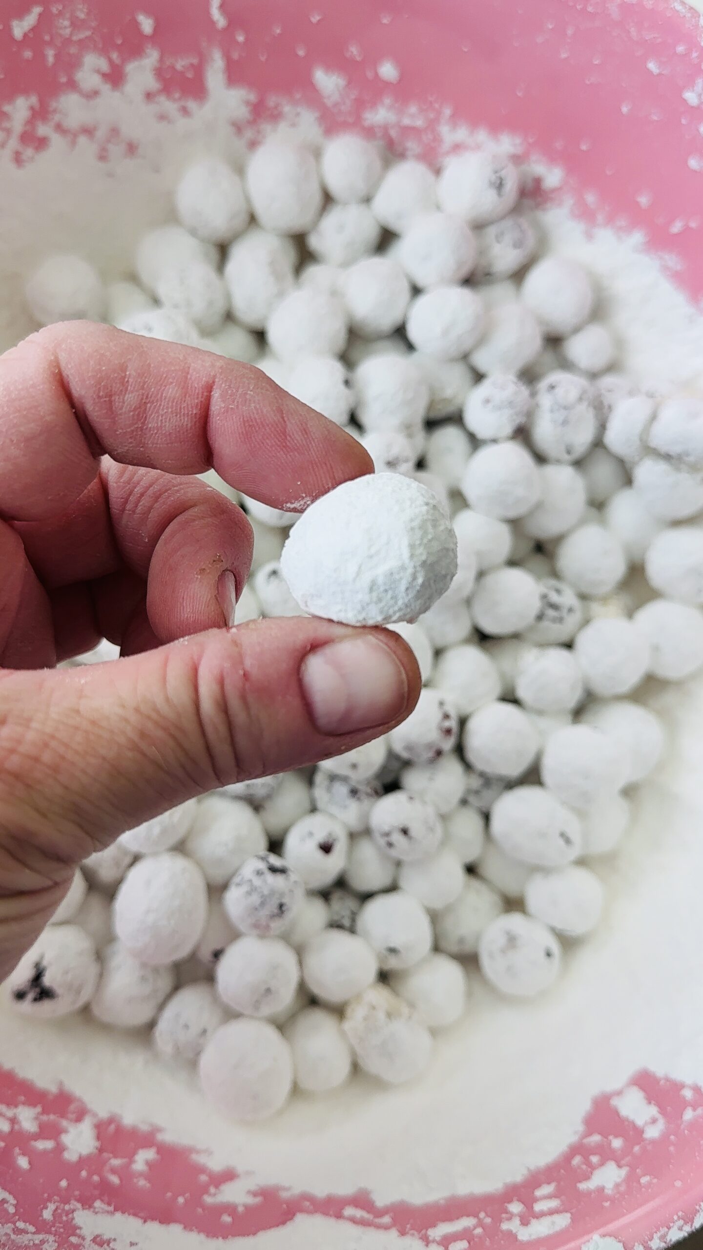 6. Coat with powdered sugar. It's easiest to shake it covered in a bowl with a lid.