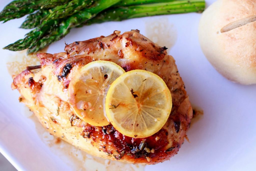 Bake for 20 minutes, then pour the remaining marinade over the chicken breasts in the baking dish. Bake for another 35 minutes until the skin is nicely golden and crispy and chicken if fully cooked. Remove from oven and baste the chicken with juices. Cover loosely with foil and let rest 10 minutes before serving. Plate, garnish with lemon slices and serve.