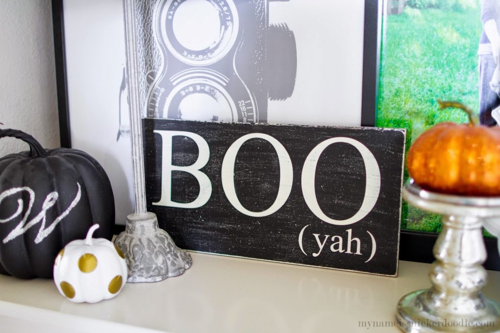 Then I had my vinyl go-to girl cut me a stencil for my new favorite Boo (yah) sign. Inspiration came from the fabulous Shop and Apparel Halloween kids shirt! It didn’t come in my size so I had to settle for a sign. LOVE IT!!!