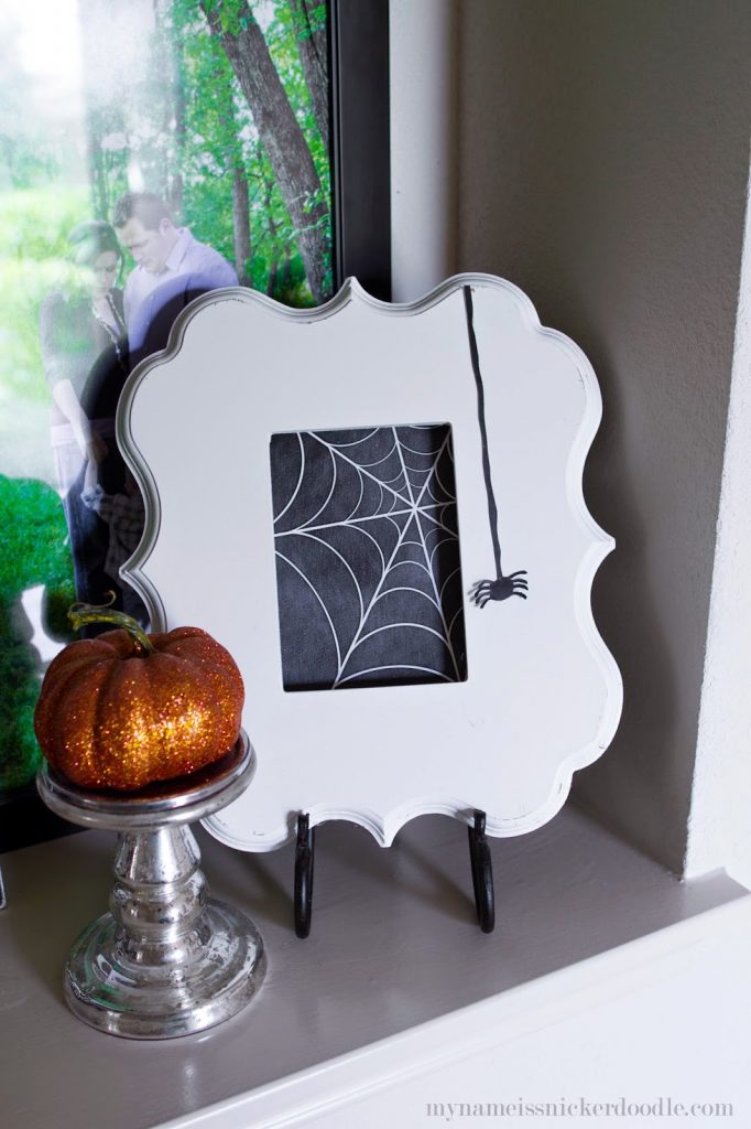 I found this spooky (yet so cute!) spiderweb printable from Landeelu. I already had the frame. It just needed a spider to add the final touch so I simple drew on on paper with a black marker and cut it out. Really fancy, right! It’s what you’ve got to do when you don’t have any of those nice paper cutter machines most everyone else has. It’s called street smarts, peeps! Ha!