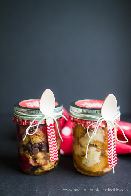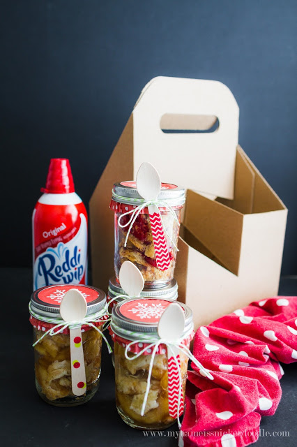 3. For the Caramel Apple Pie, place half of the slice into the bottom of the jar and drizzle with about 1/4 cup caramel sauce. Place the other half of the apple pie on top and drizzle with another 1/4 cup caramel sauce. Repeat with one more jar.