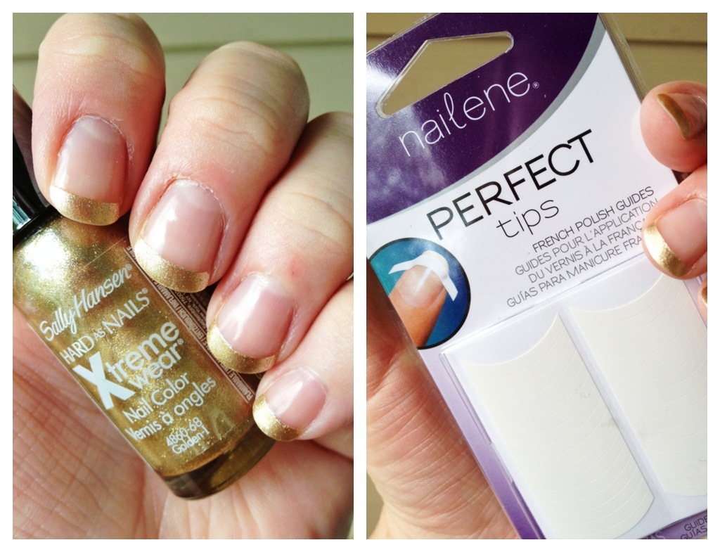 I chose gold, but you could do any color.  Place the stickers on your nails and paint a thin coat on your tips.  Let it dry and then paint another thin coat.  Let dry completely before peeling the sticker off.  Paint complete nail with a clear coat and let dry.  Enjoy!