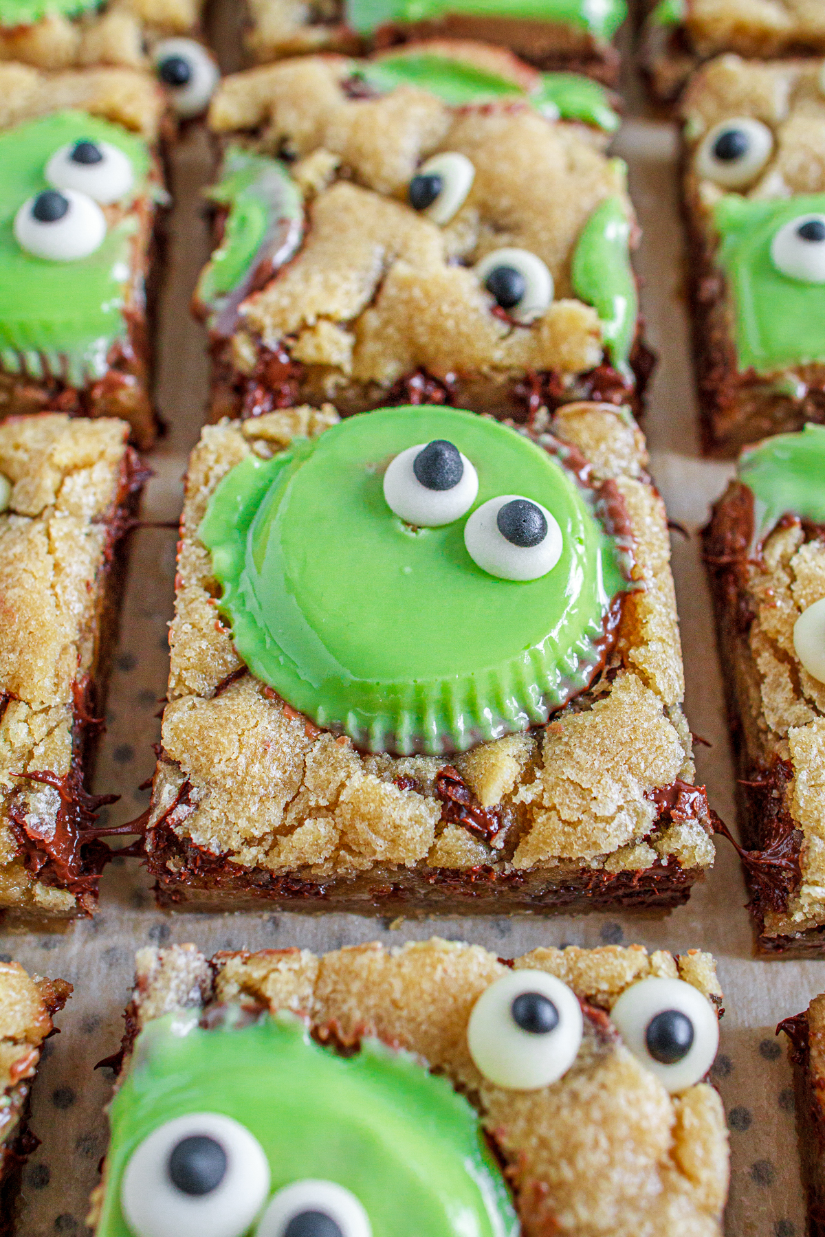 Monster Peanut Butter Cookie Bars might just be the perfect Halloween treat! This easy recipe is super simple to make, but creates the biggest impact for a spooky and fun dessert. It is a chocolate chip cookie base and dotted with Homemade Googley Eyes. The ghoulish feature is the festive green peanut butter cups pressed into the freshly baked cookie bars and then embellished with more candy eyes.
