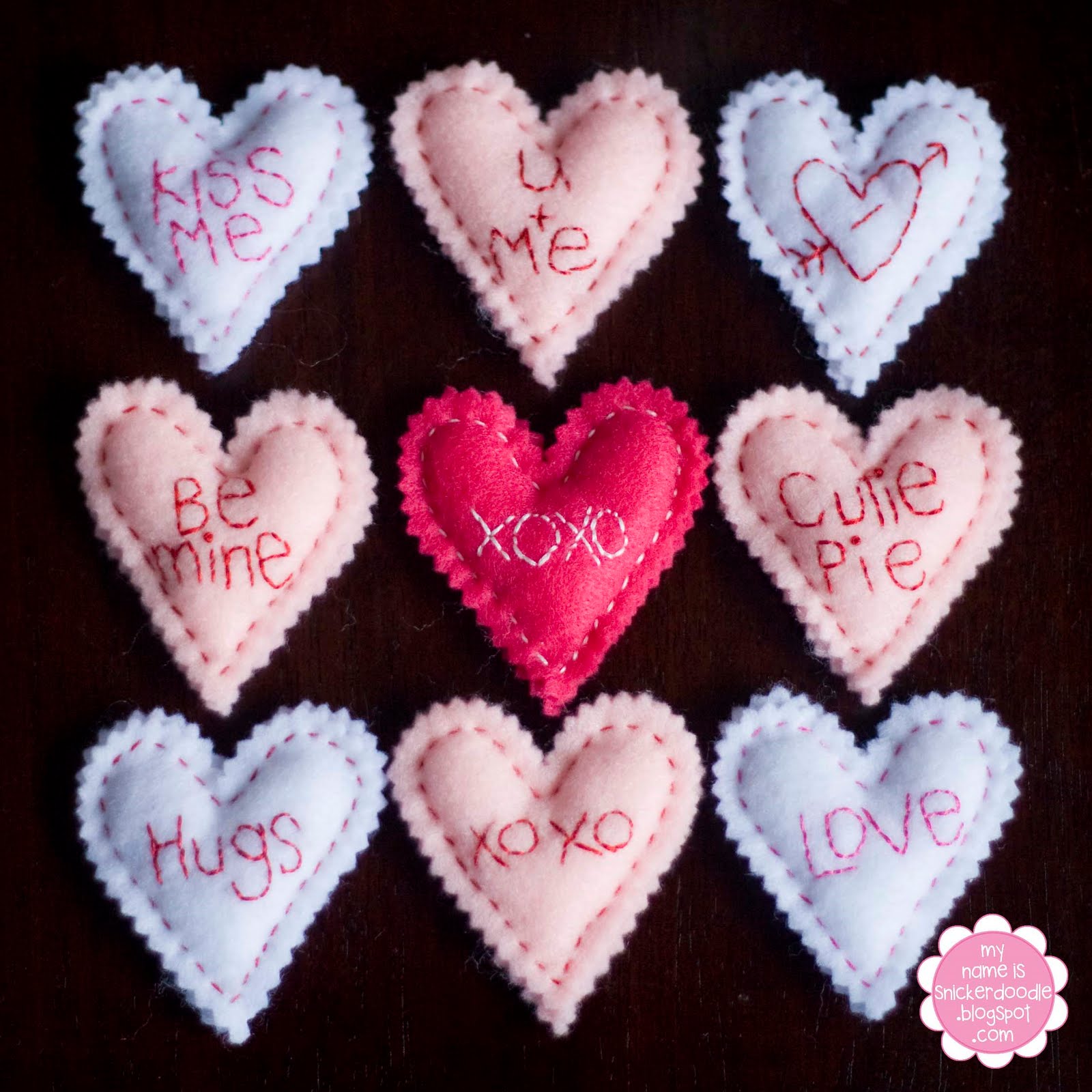 Today I put up some of my Valentine’s decorations that I almost forgot about. I got a huge smile on my face when I pulled out the bag of felt hearts that I sewed a few years ago and then added some fun felt conversational hearts to the year after. I’ve got them in a fun clear candy jar.