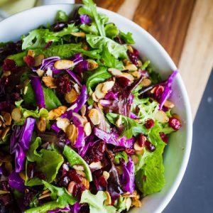 This whole salad has a great texture and the dressing is totally unexpected. You could definitely add in different dried berries, but don’t cut corners and skip toasting the almonds. I think it’s what makes the salad as great as it is.