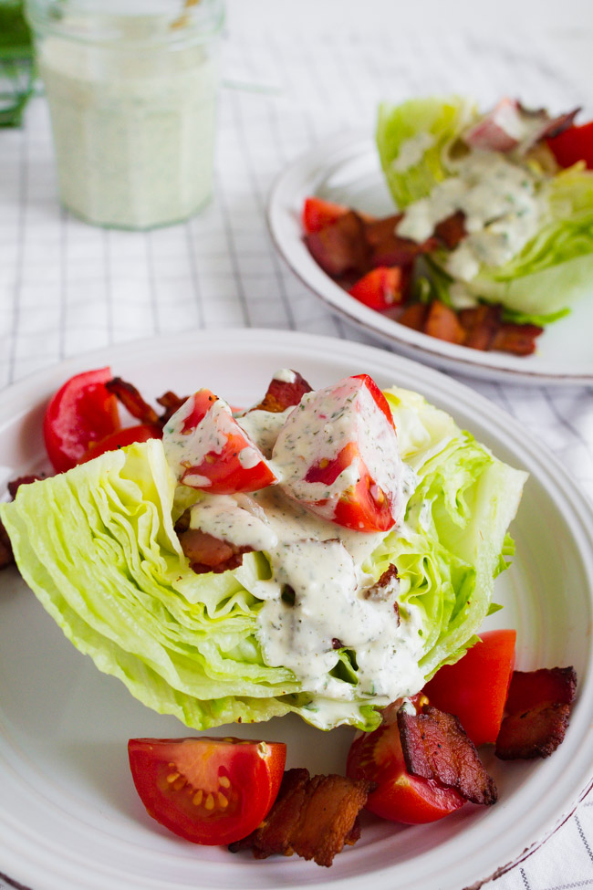 I recently saw a foodie video that follows trends (yes, they’re are food trends!) and this person said Wedge Salads are making a comeback. I prefer mine with Homemade Ranch Dressing, but they are classically served with a Blue Cheese Dressing of some sort. Either way, as long as all of the ingredients are crisp and fresh, a wedge salad is always satisfying!